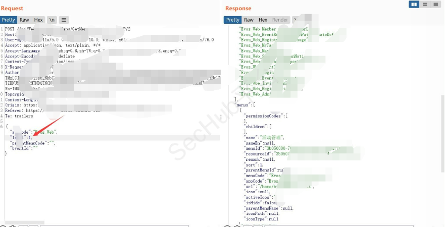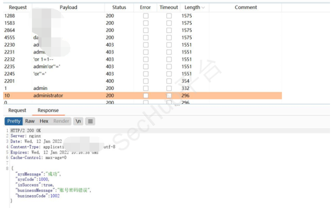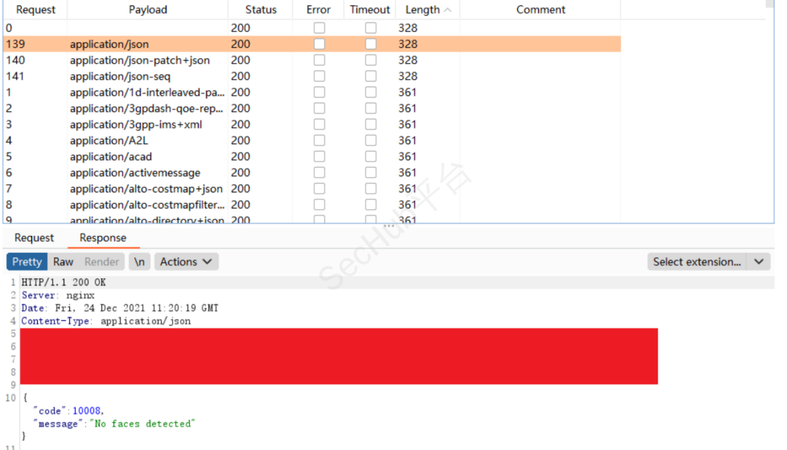 6、FUZZ出来application/json的content-type头可用,那么很简单了,构造JSON数据,继续FUZZ JSON数据参数