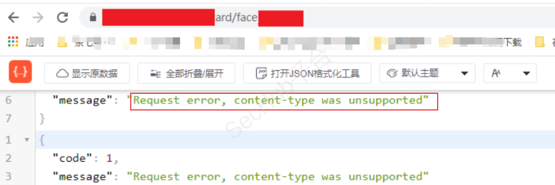 4、POST随便传个参过去,发现接口提示"Request error, content-type was unsupported