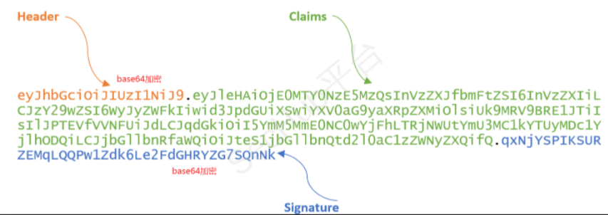JWT分为三部分:头部(Header)、声明(Claims)、签名(Signature),三个部分以英文句号隔开。JWT内容以Base64URL进行了编码。