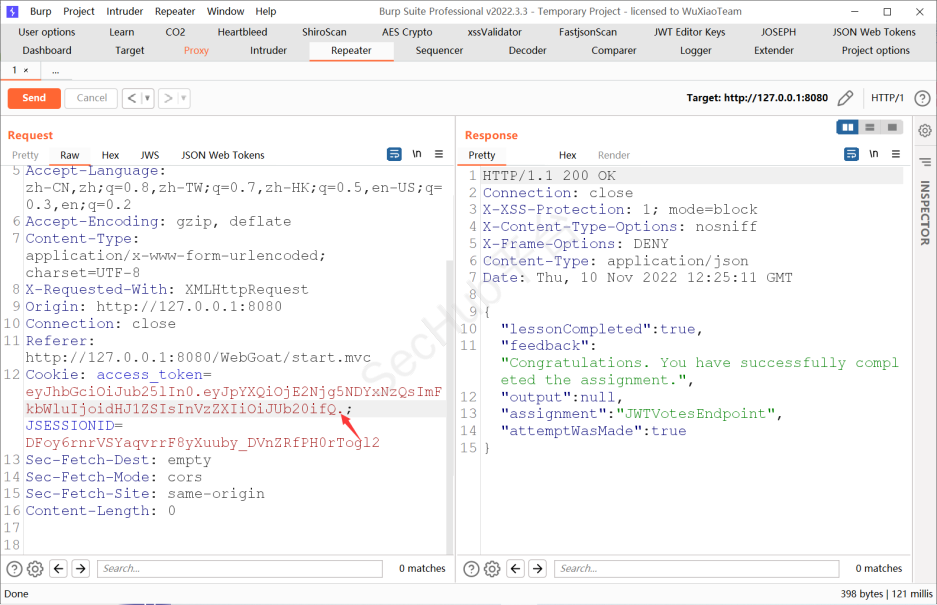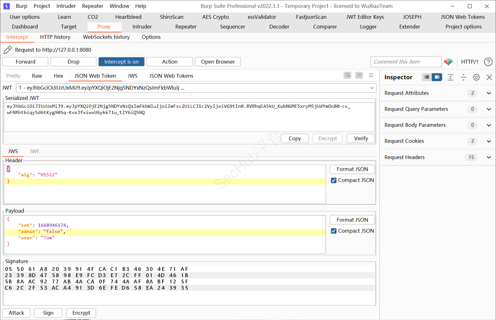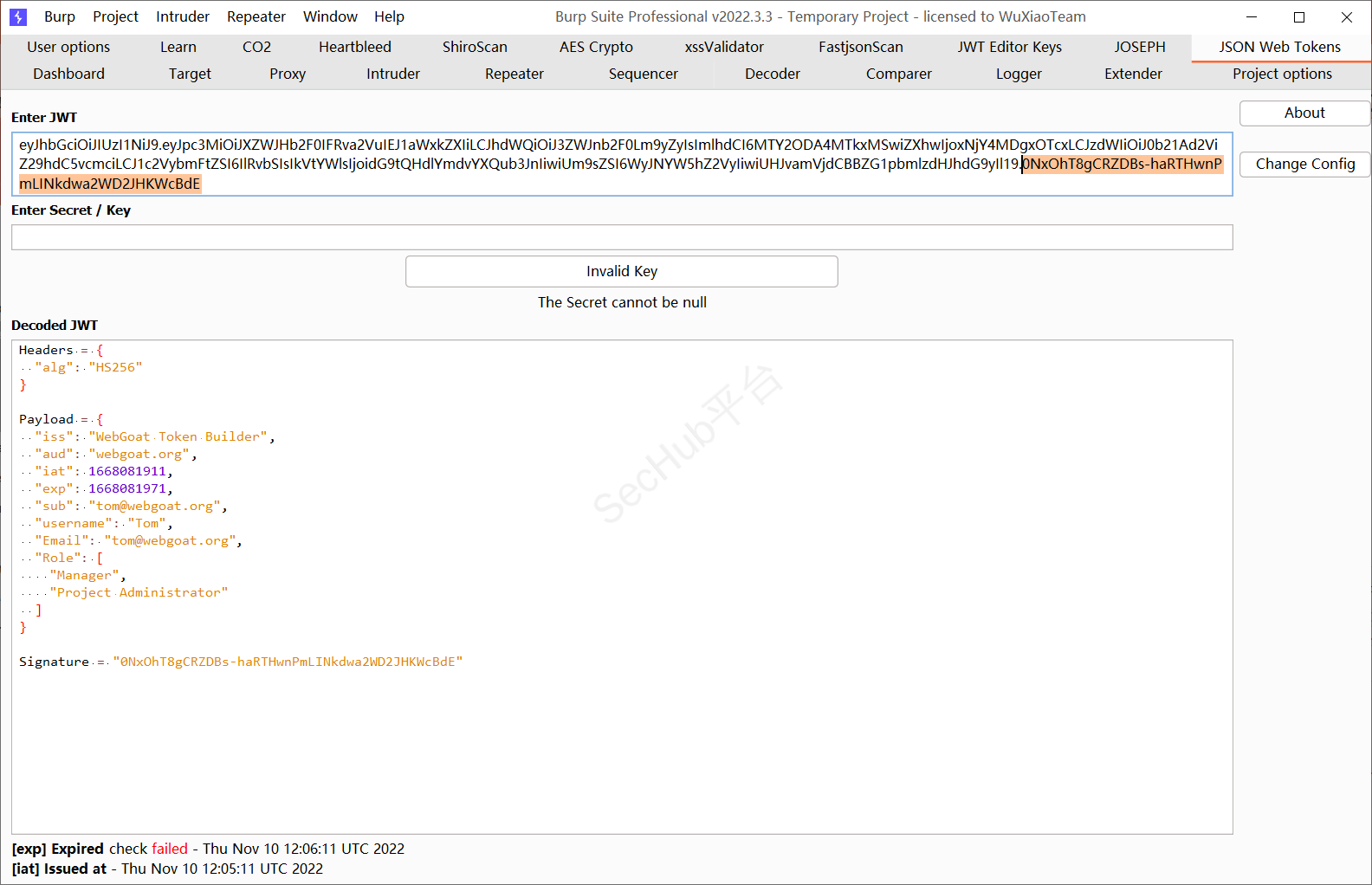 将那段Cookie中的JWT字段解密一下这里使用Burp商店自带的JWT解密