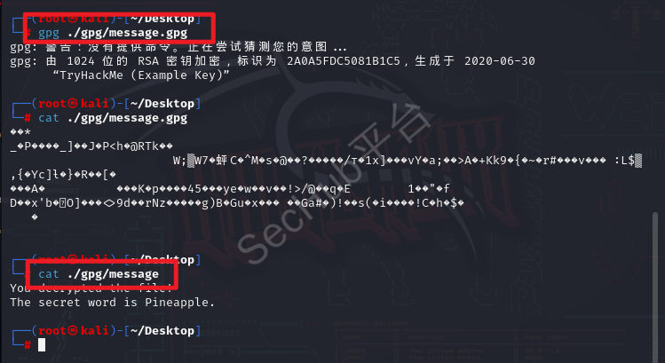 然后我们来解密gpg文件,解密后会生成一个message文件,读取一下message得到密码
