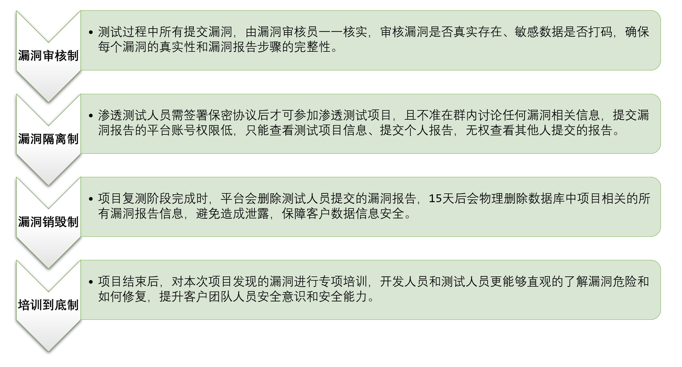 为保证按计划、高质量地完成测试工作,应当明确测试记录和测试报告要求, 明确测试过程中每一阶段需要产生的相关文档,使测试有章可循。在委托协议和实施方案中,需要明确双方的人员职责、测试对象、时间计划、测试内容要求等。