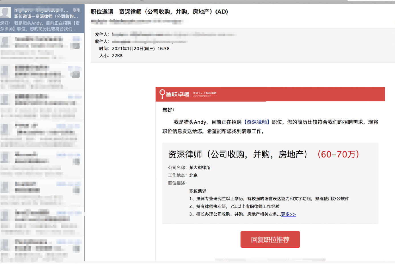 伪造面试候选人发送钓鱼邮件,面对对象:财务、法务、HR。